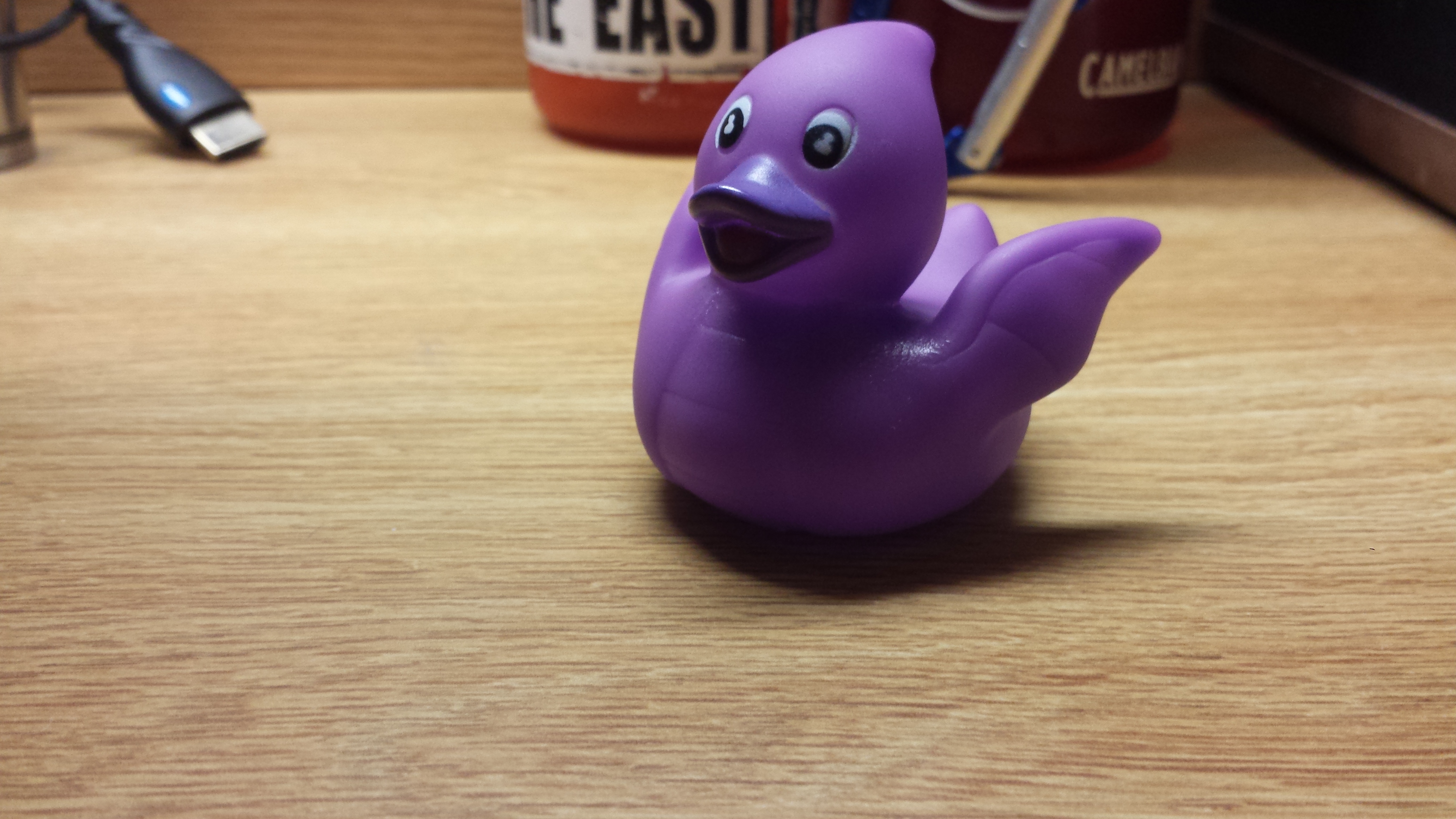 That's my duck. No, it doesn't have a name, it's just the duck. The duck was given to me by a Googler (hiring manager??) at a how-to-interview-at-Google talk at my university. They gave everyone ducks in fact, though they had a nice showing of diversity (you'll notice mine is purple and has no hat).